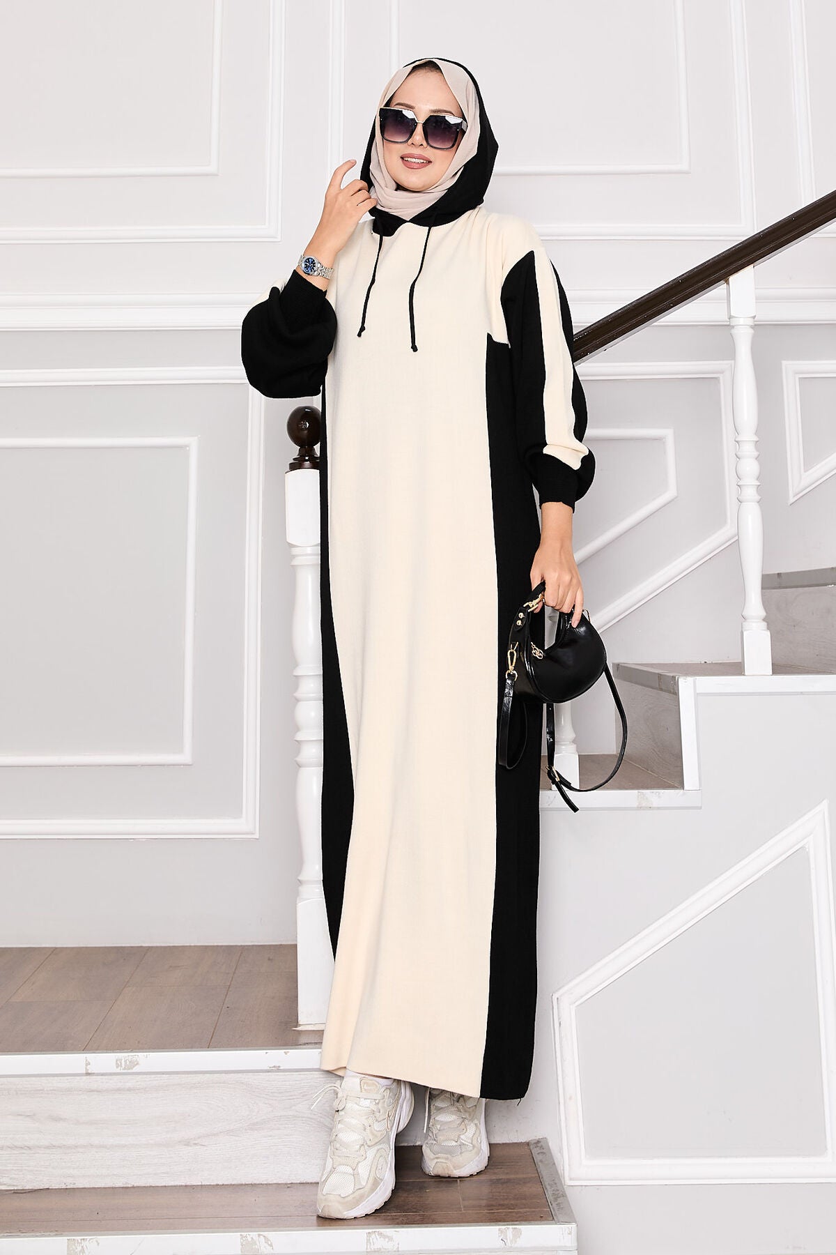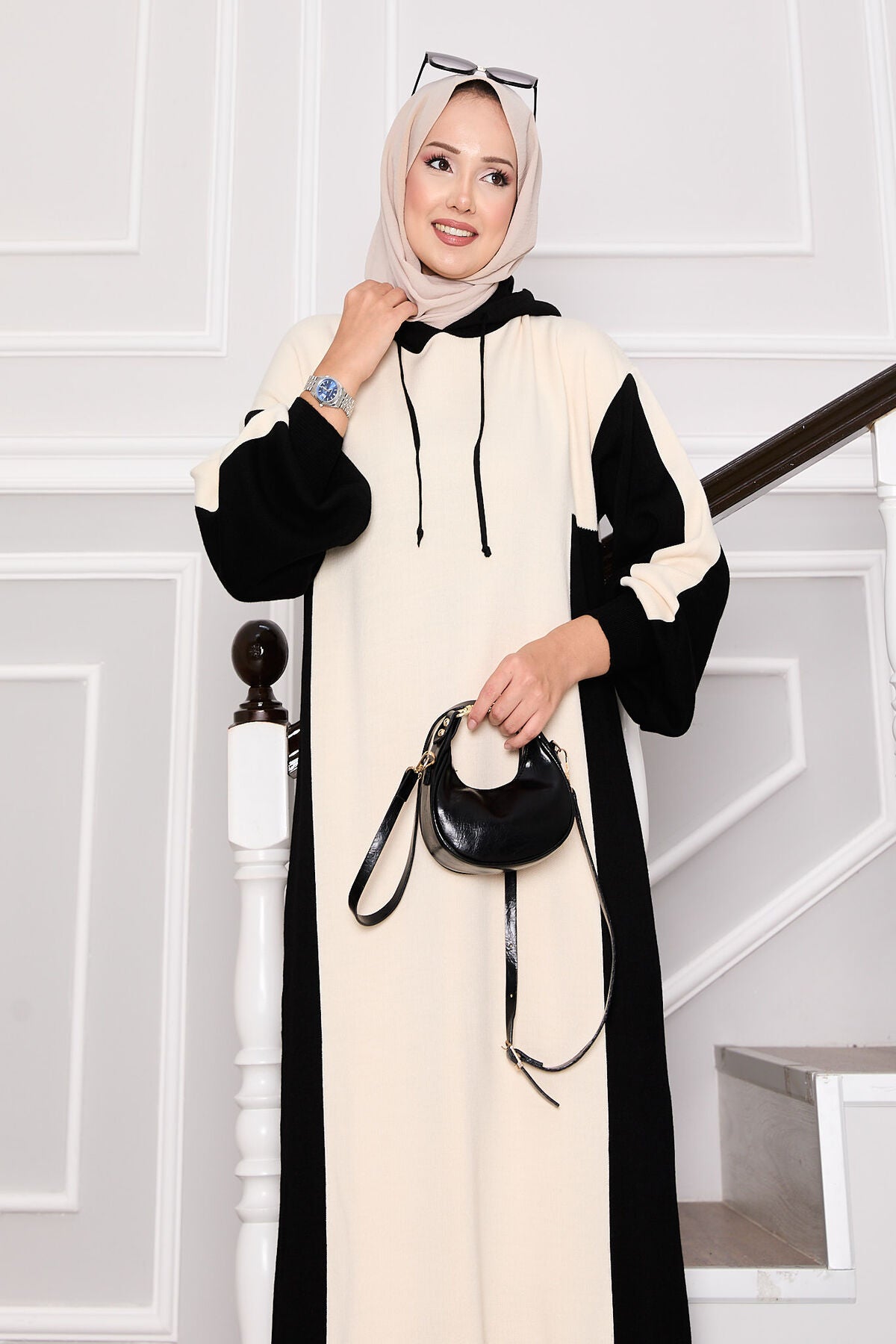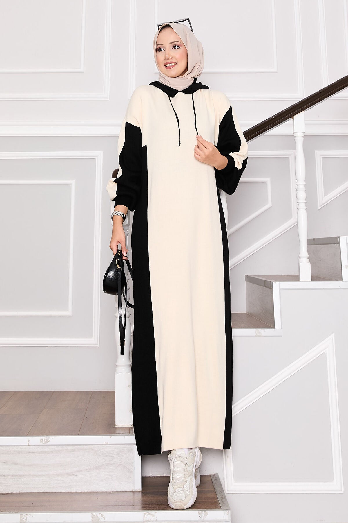 Ürün mevsimliktir. Yeni sezon kapüşoneli iki renkli triko elbise