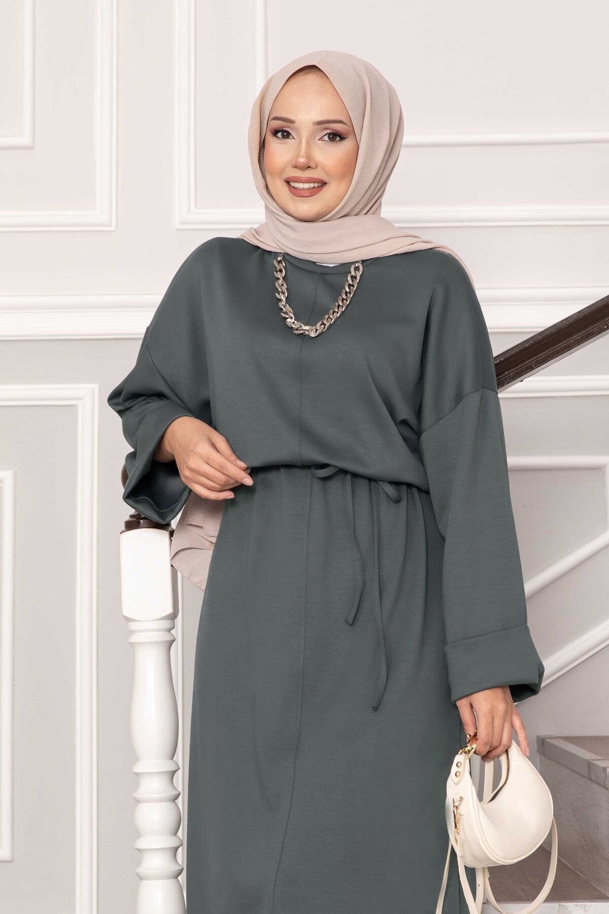 Ürün Sonbahar & Kış modasıdır. Kolu katlana bilir seyyar ip kuşaklı tam boy tesettür elbise"