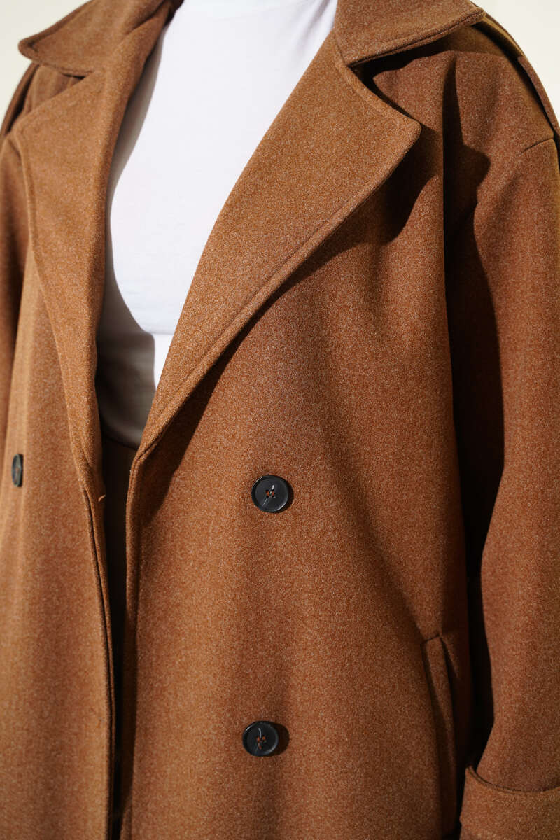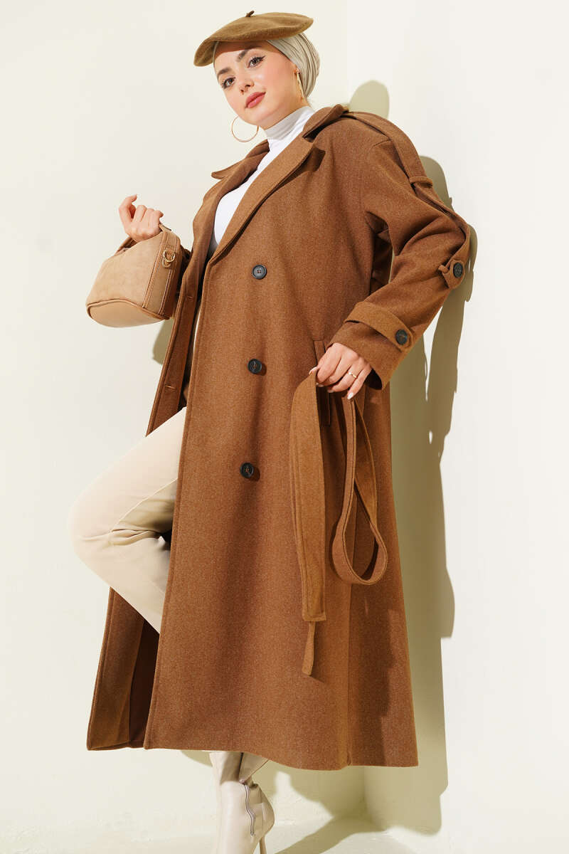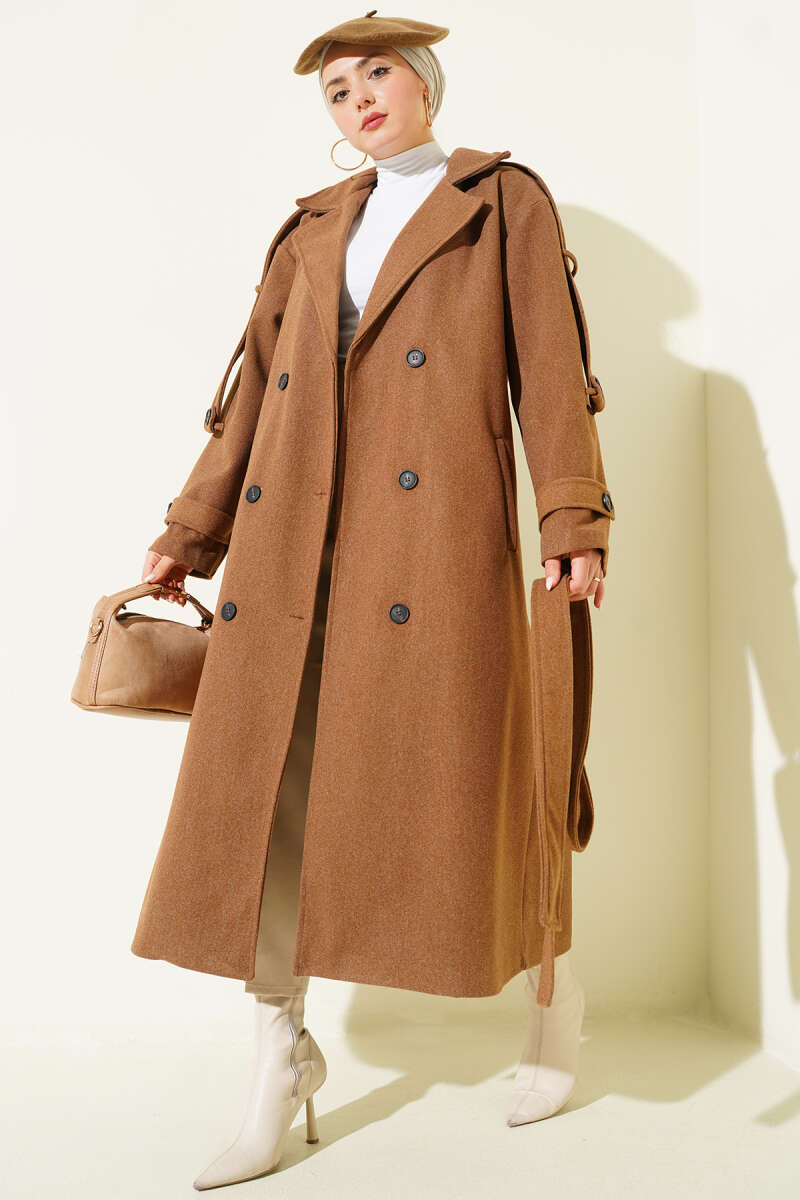 Kuşaklı Düğme Detaylı Kaşe Kaban Kestane