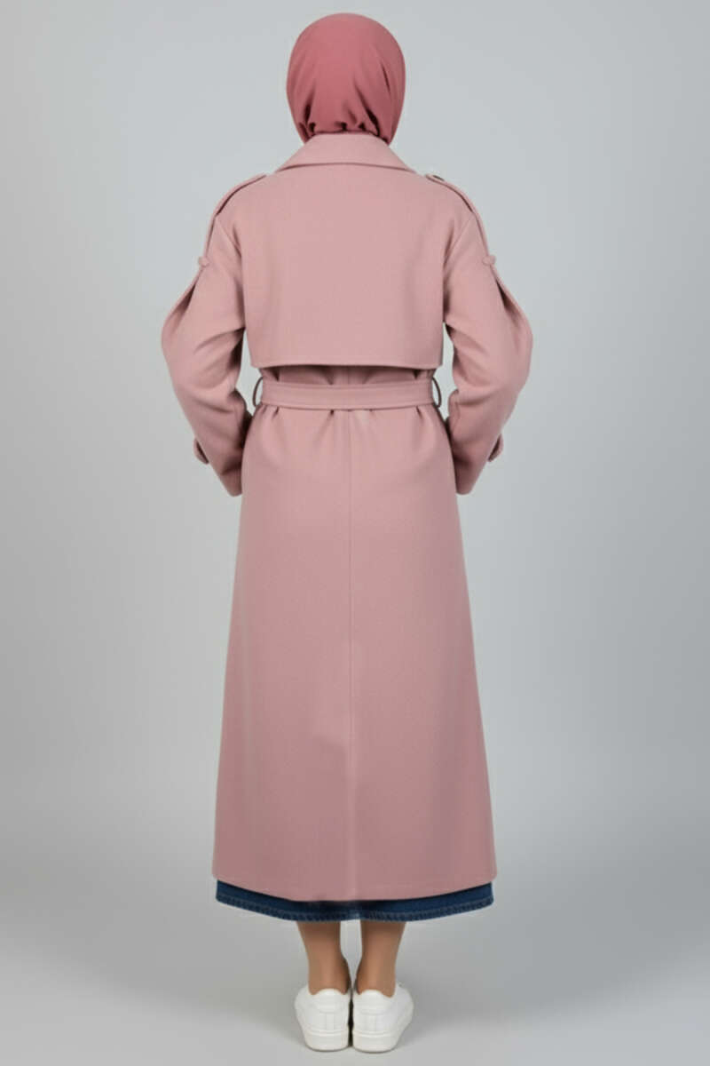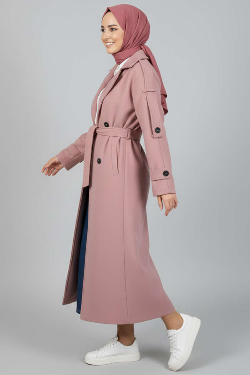Kuşaklı Düğme Detaylı Kaşe Kaban pudra
