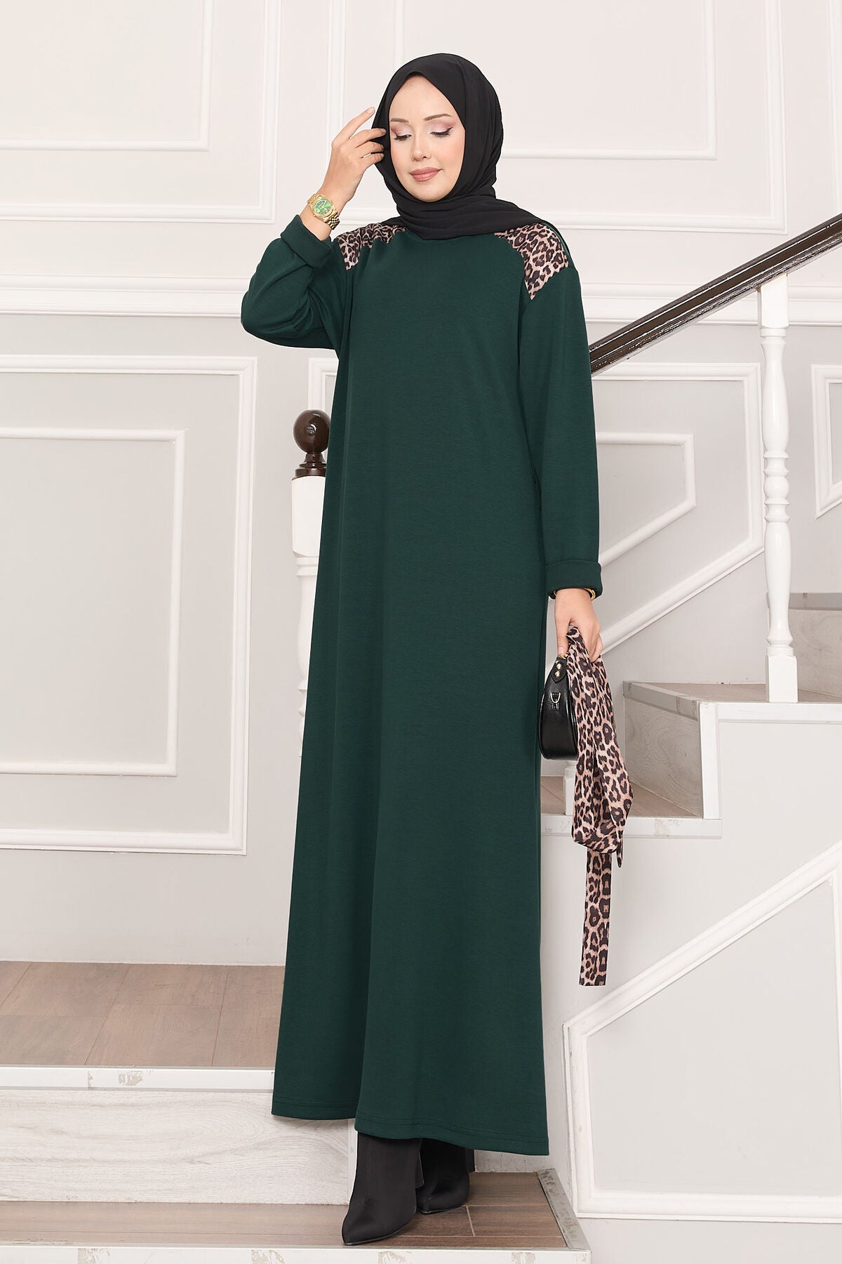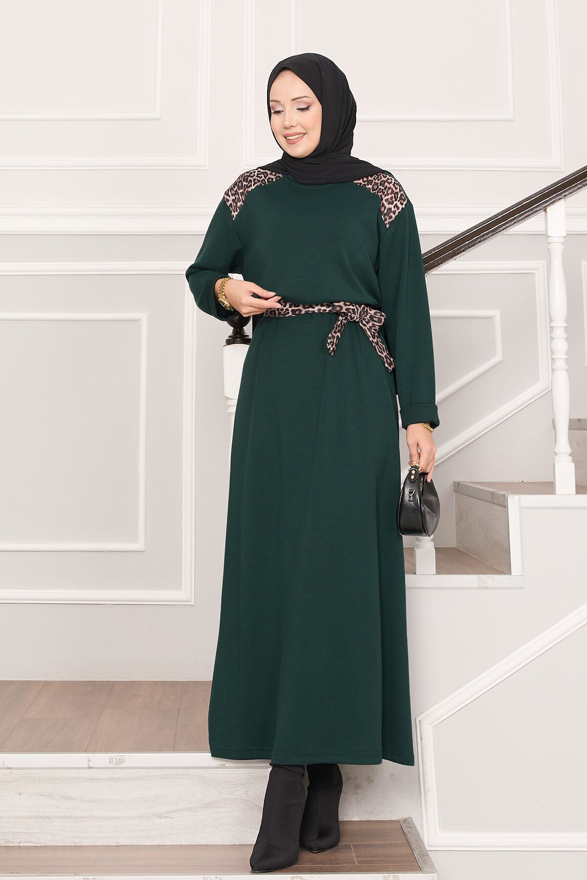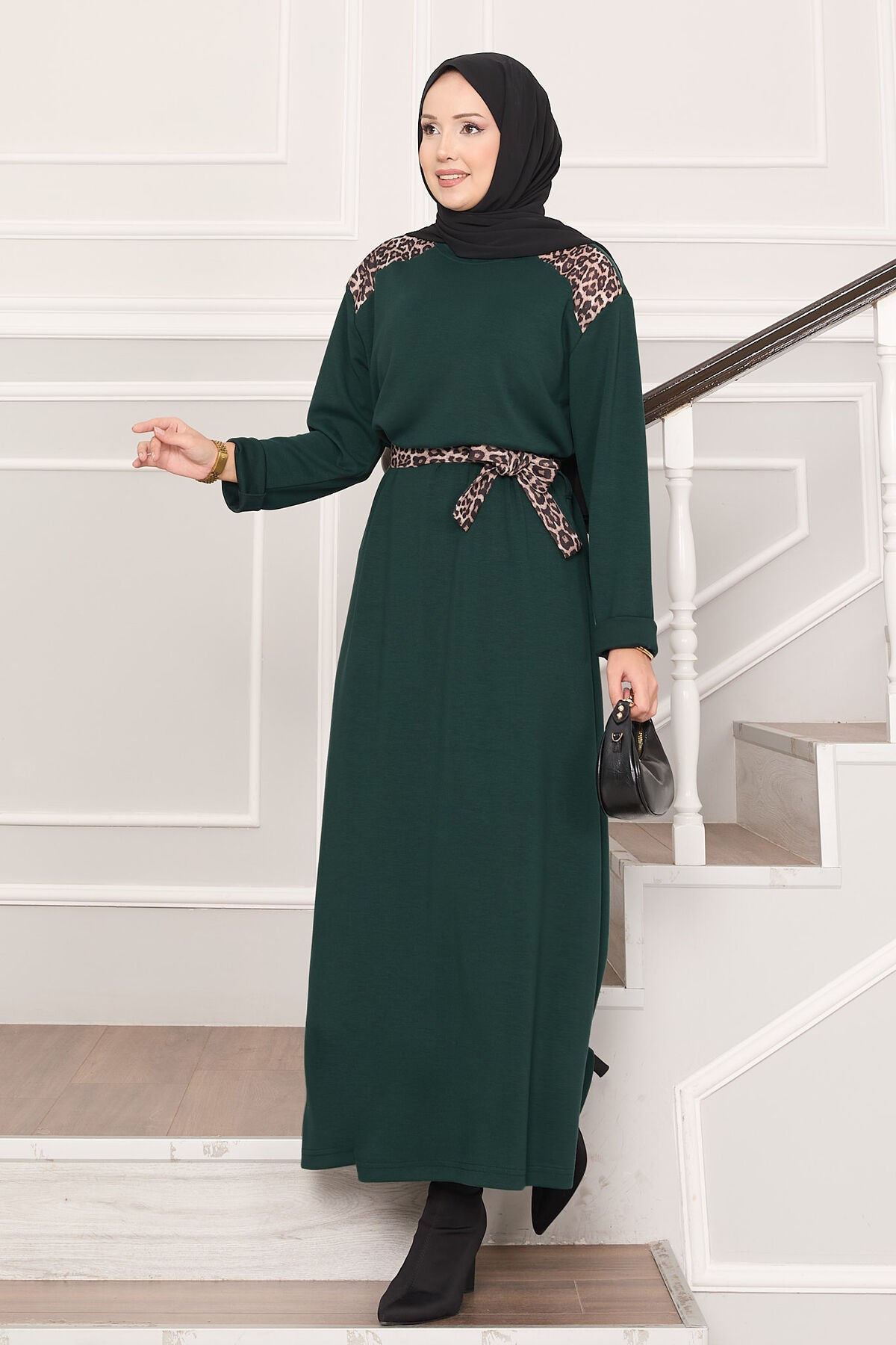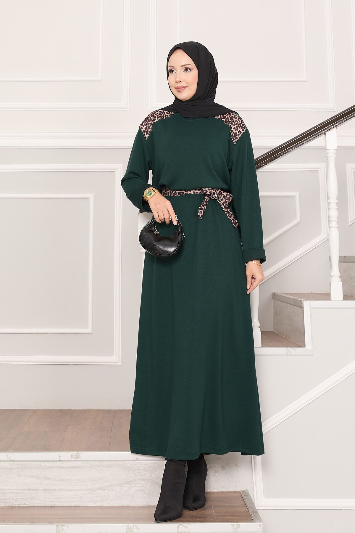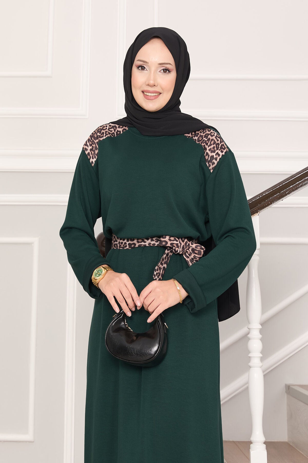 Leopar Garnili Kuşaklı Oyşo Elbise Zümrüt