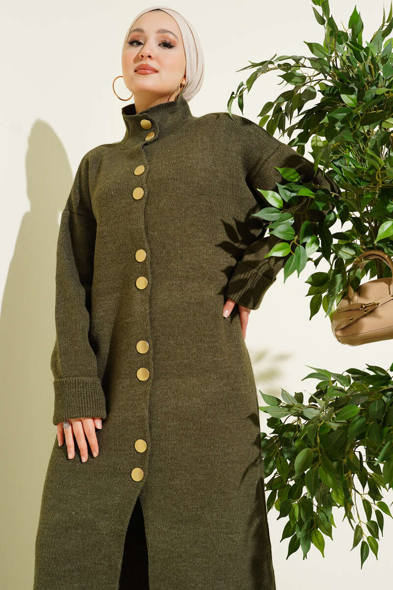 Metal Gold Düğmeli Uzun Triko Hırka haki