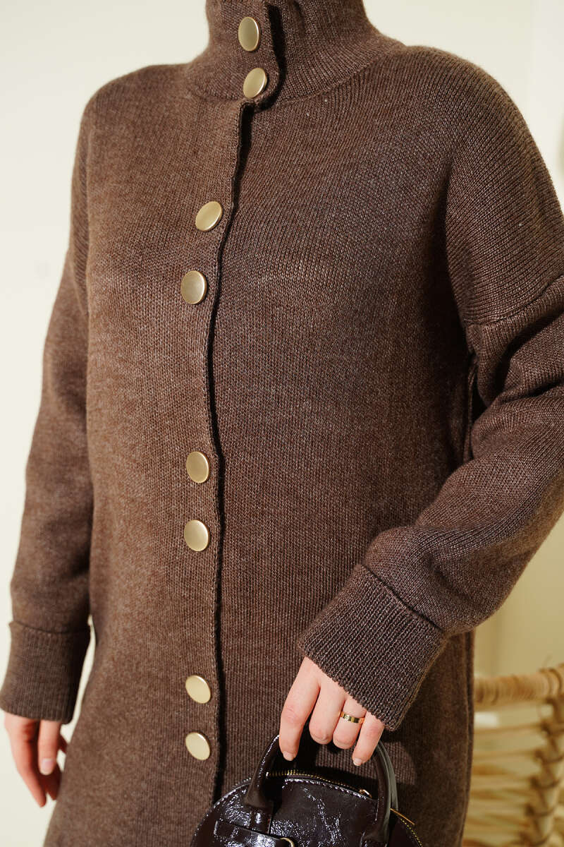 Metal Gold Düğmeli Uzun Triko Hırka kahverengi