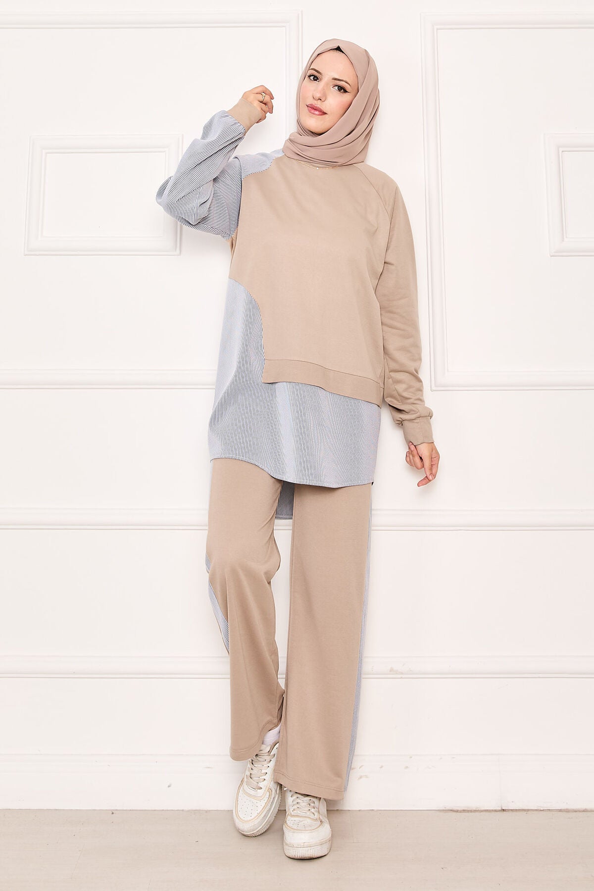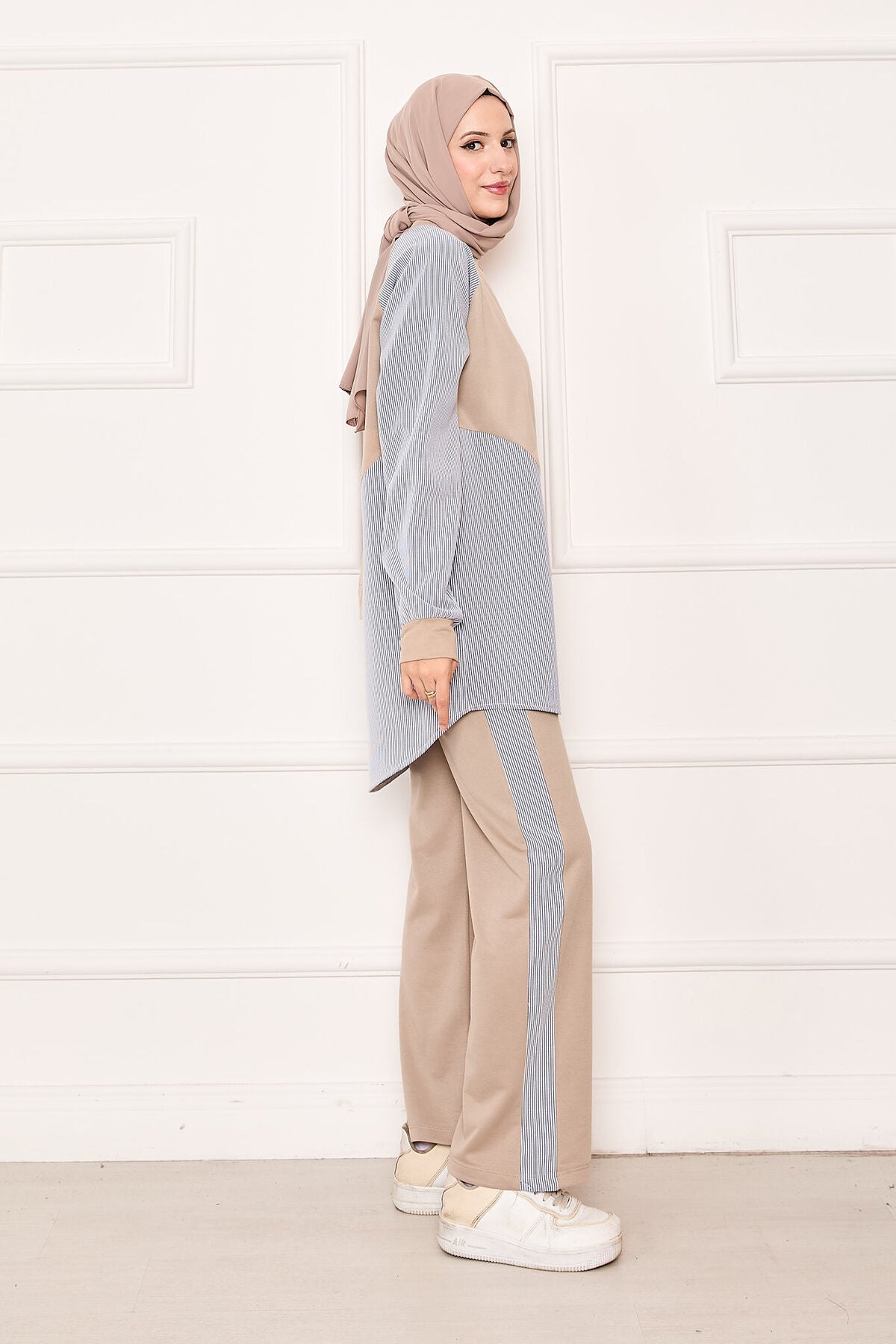 Önü Asimetrik Çizgi İkili Takım Bej