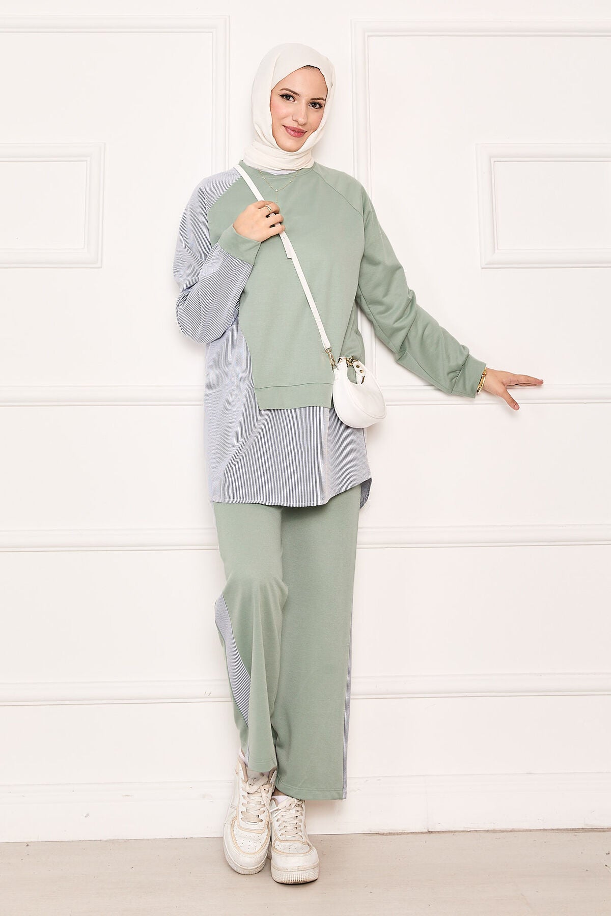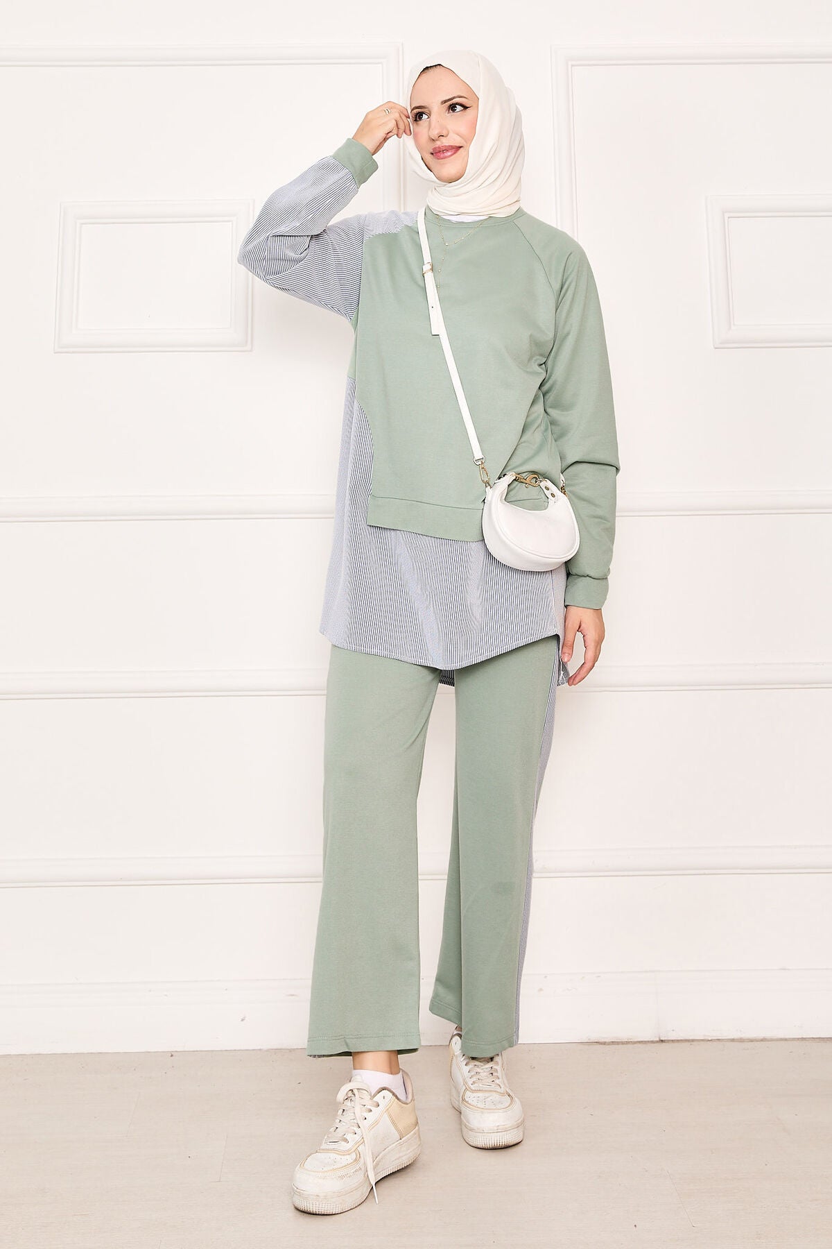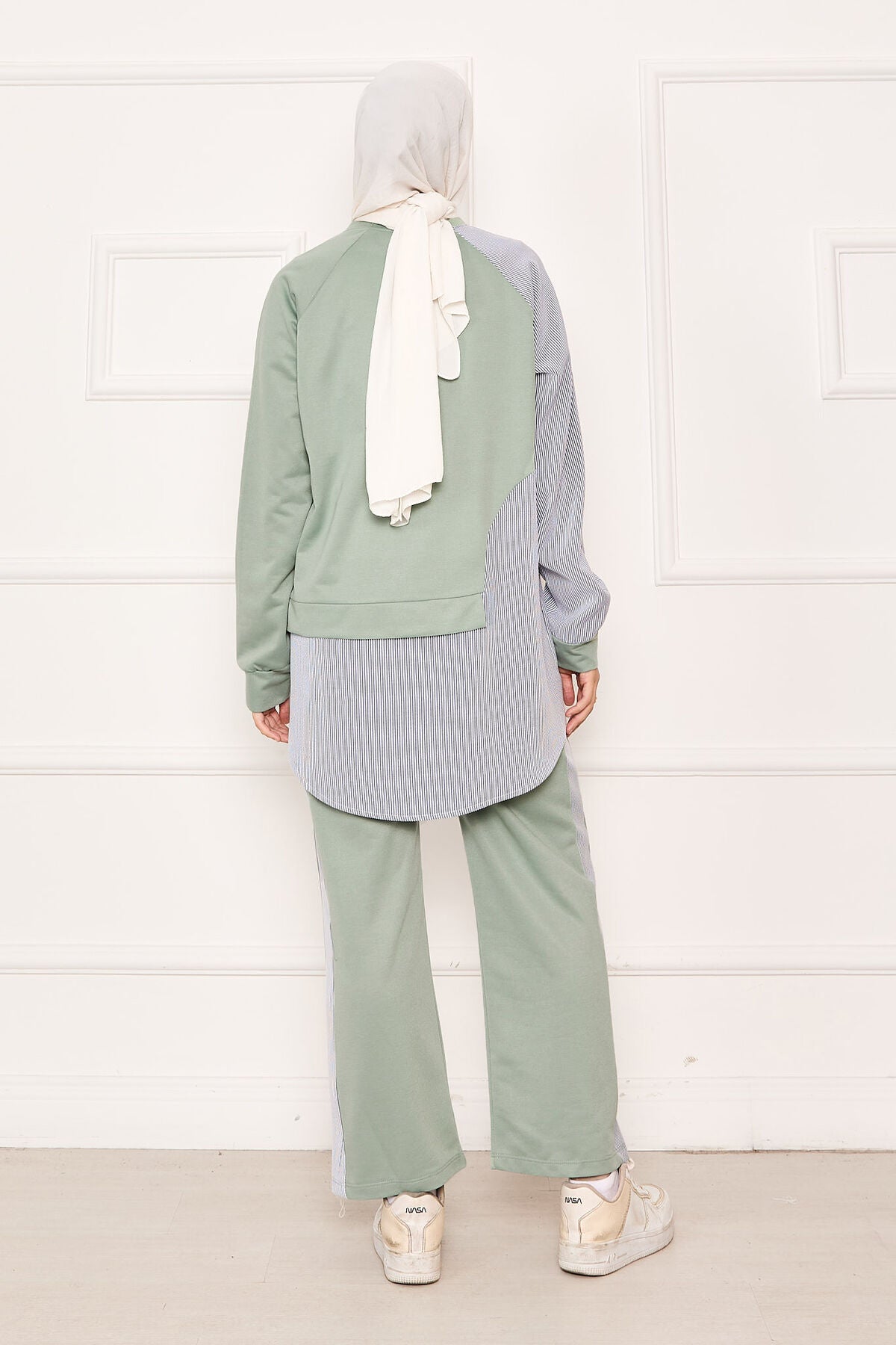 Ürün mevsimliktir. Tunik pantolon olmak üzere iki parçadan oluşmaktadır. Çizgi detaylı asimetrik bir tasarımı mevcut çizgili garni detaylı spor kombin, pantolon belden lastiklidir. İç göstermez.