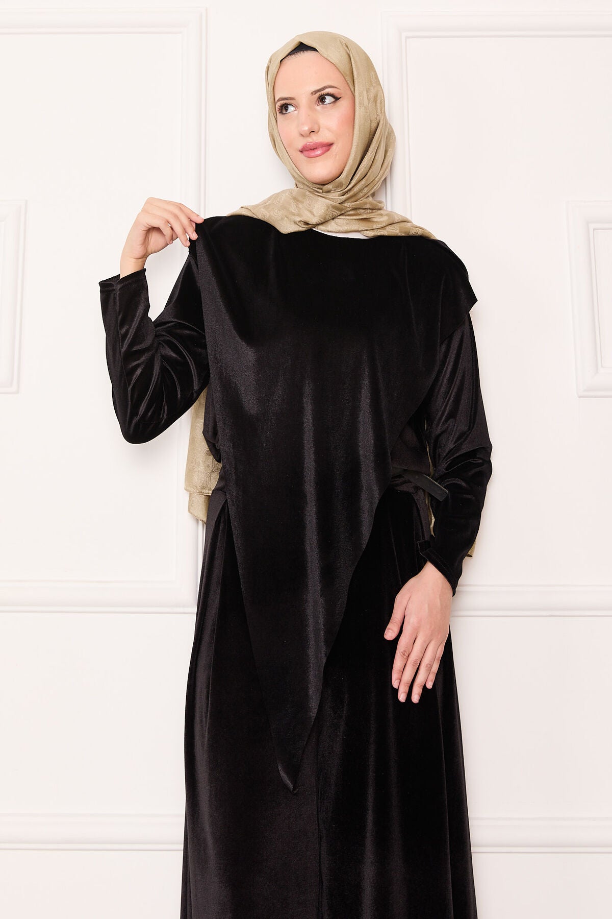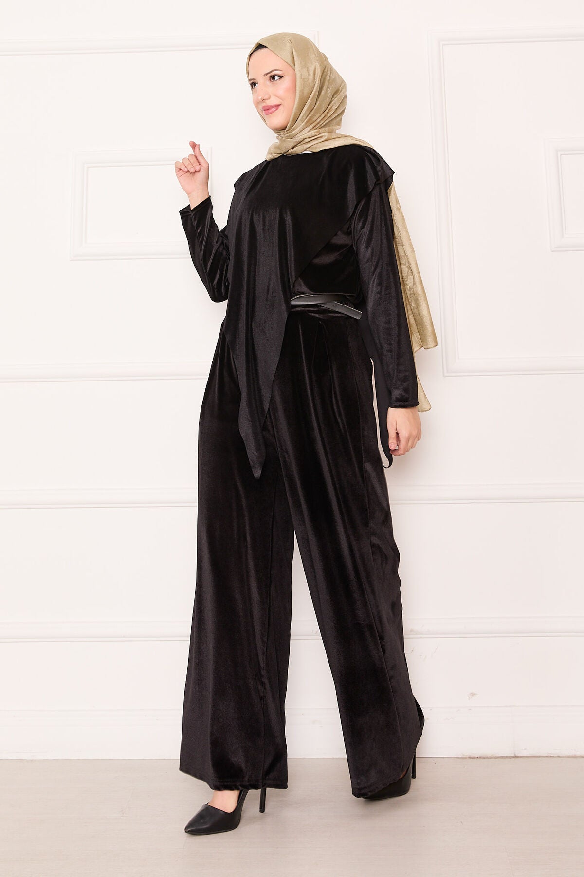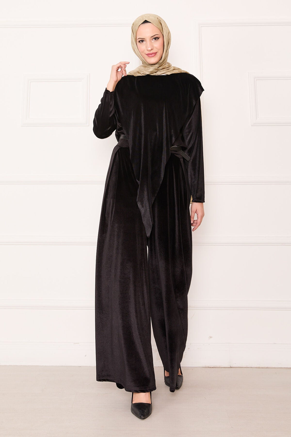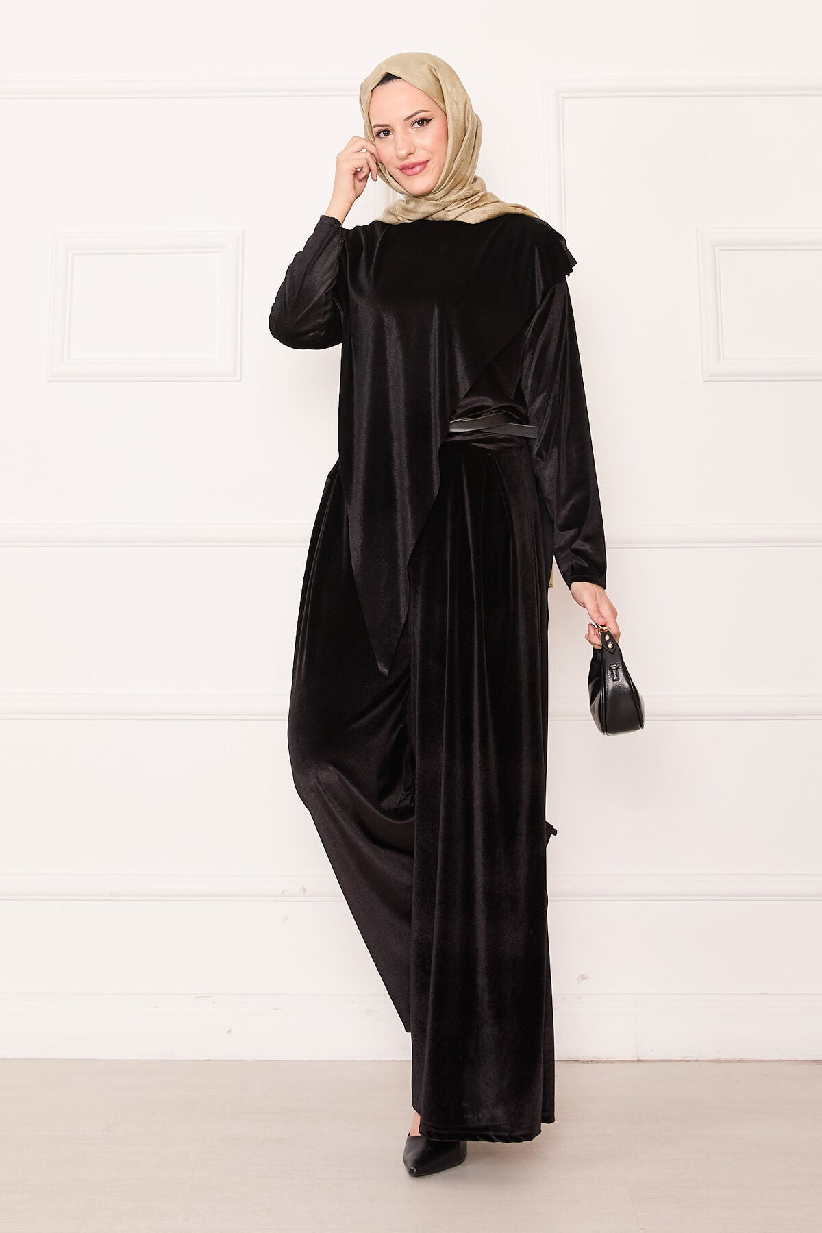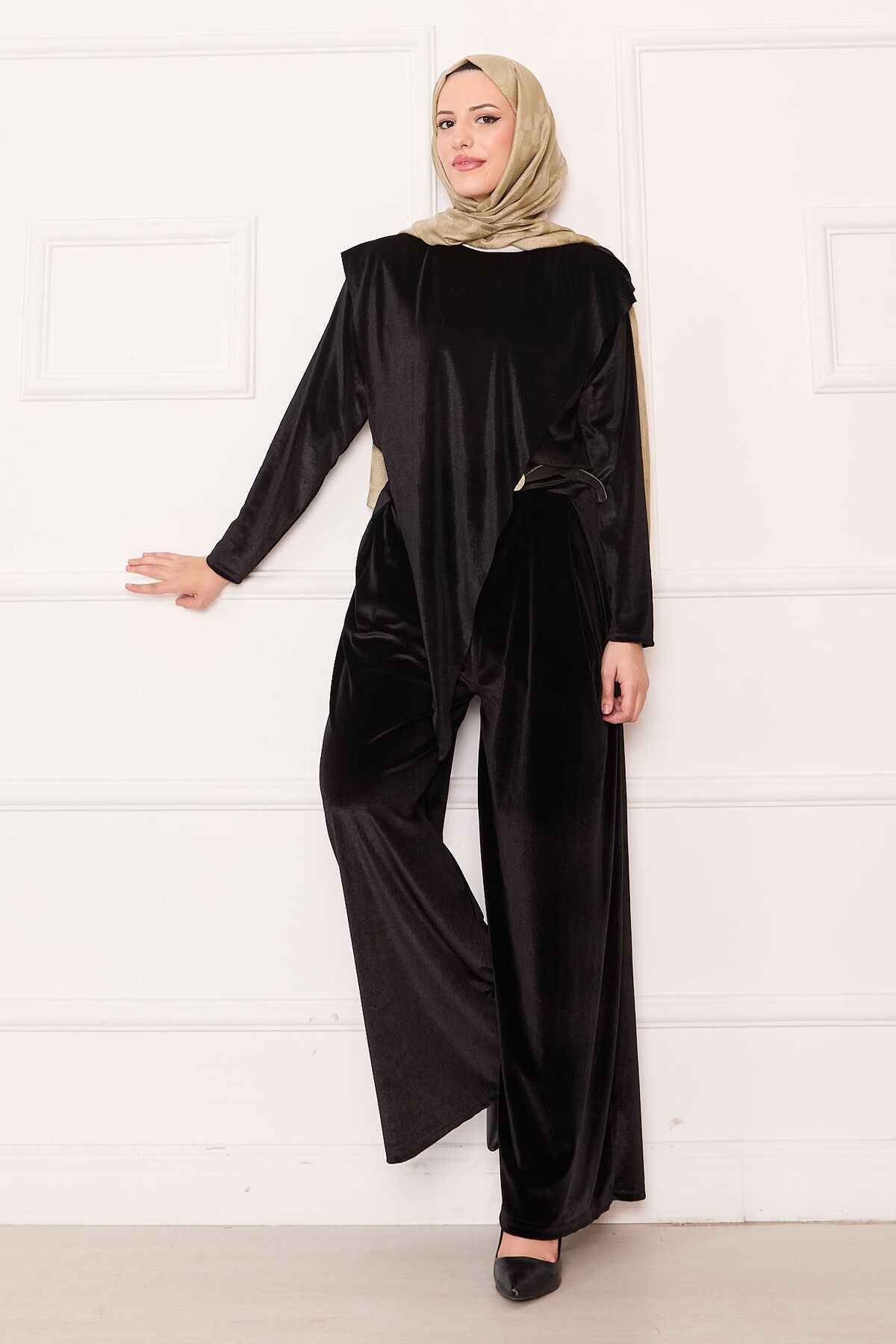 Önü Asimetrik Detaylı Kadife Takım siyah