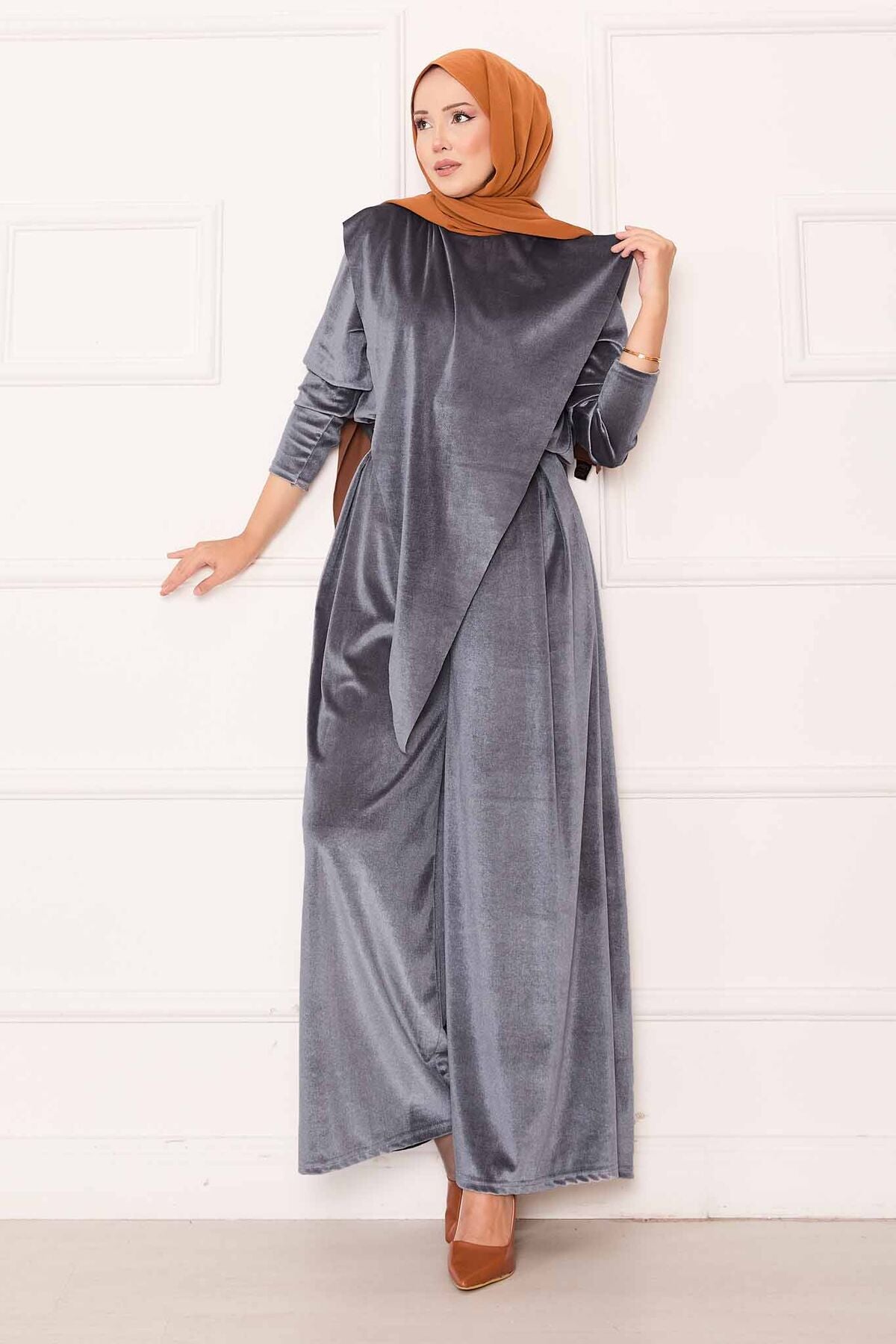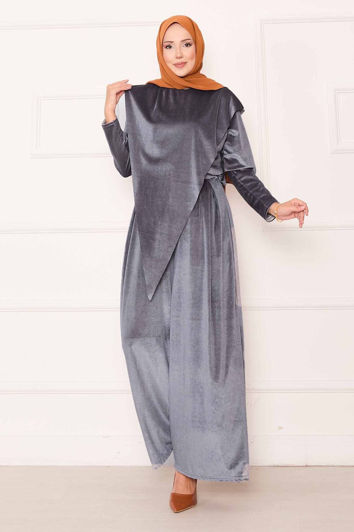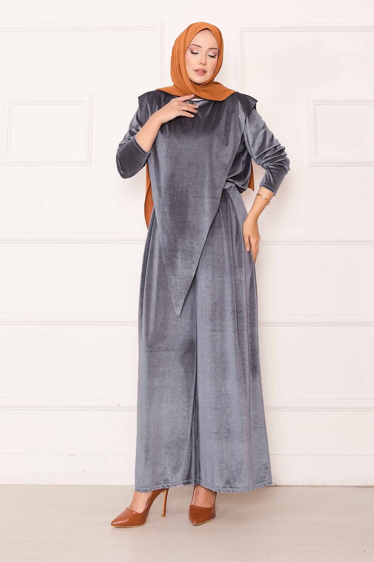 Önü Asimetrik Kadife Takım gri