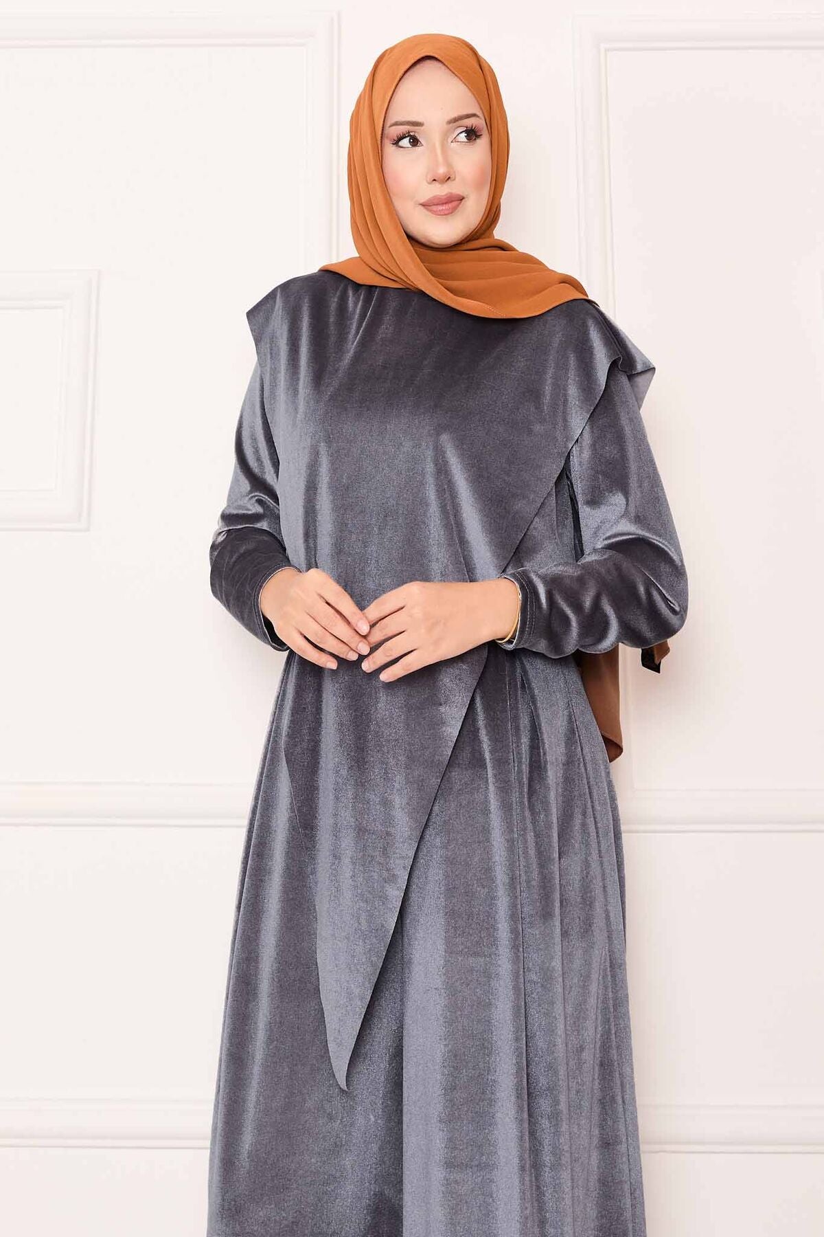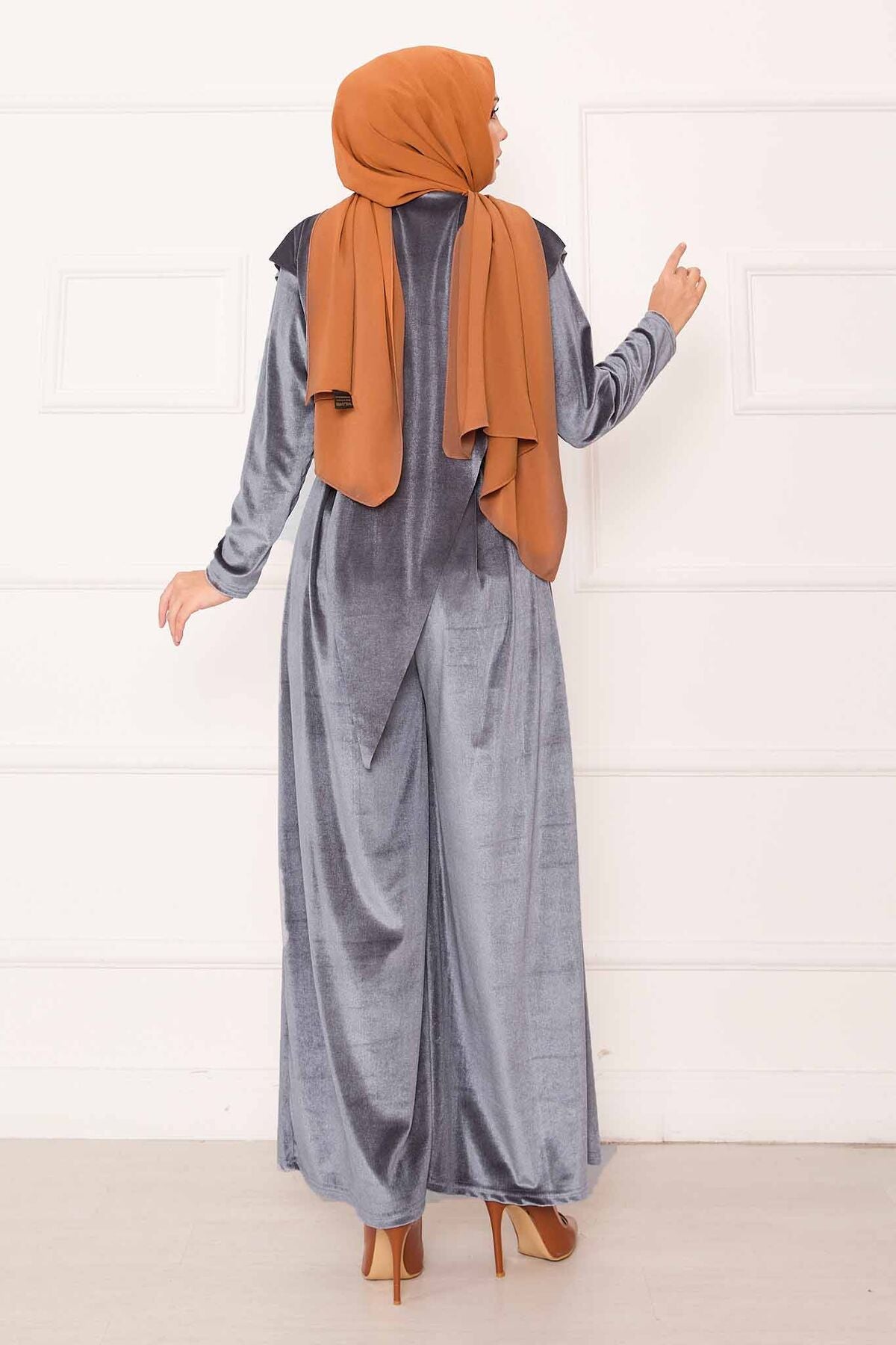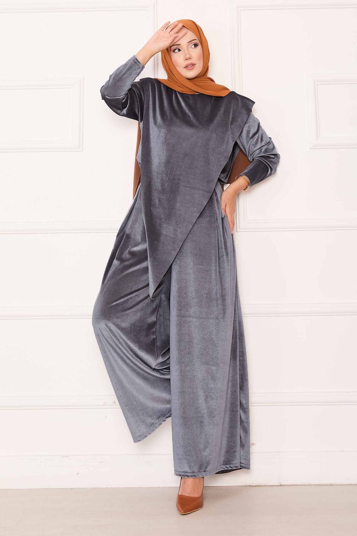 Önü Asimetrik Kadife Takım gri