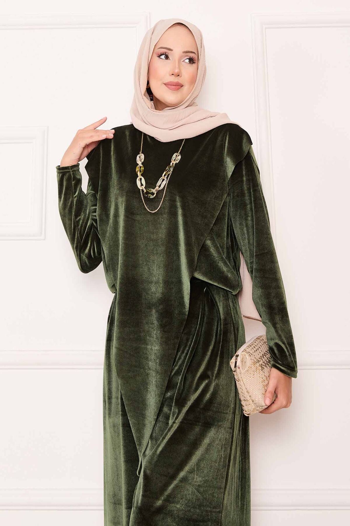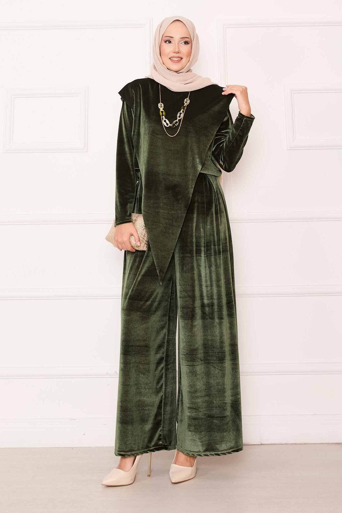 Ürün mevsimliktir. Ürün tunik ve pantolon olmak üzere iki parçadan oluşmaktadır. Tunik asimetrik kesime sahiptir. Görselde tunik pantalonun içine konmuştur. Pantolon belden lastiklidir. Pantolonda pile detayı mevcuttur önden iki adet pile detayı vardır. Kemer ürüne dahil değildir kombin parçasıdır.