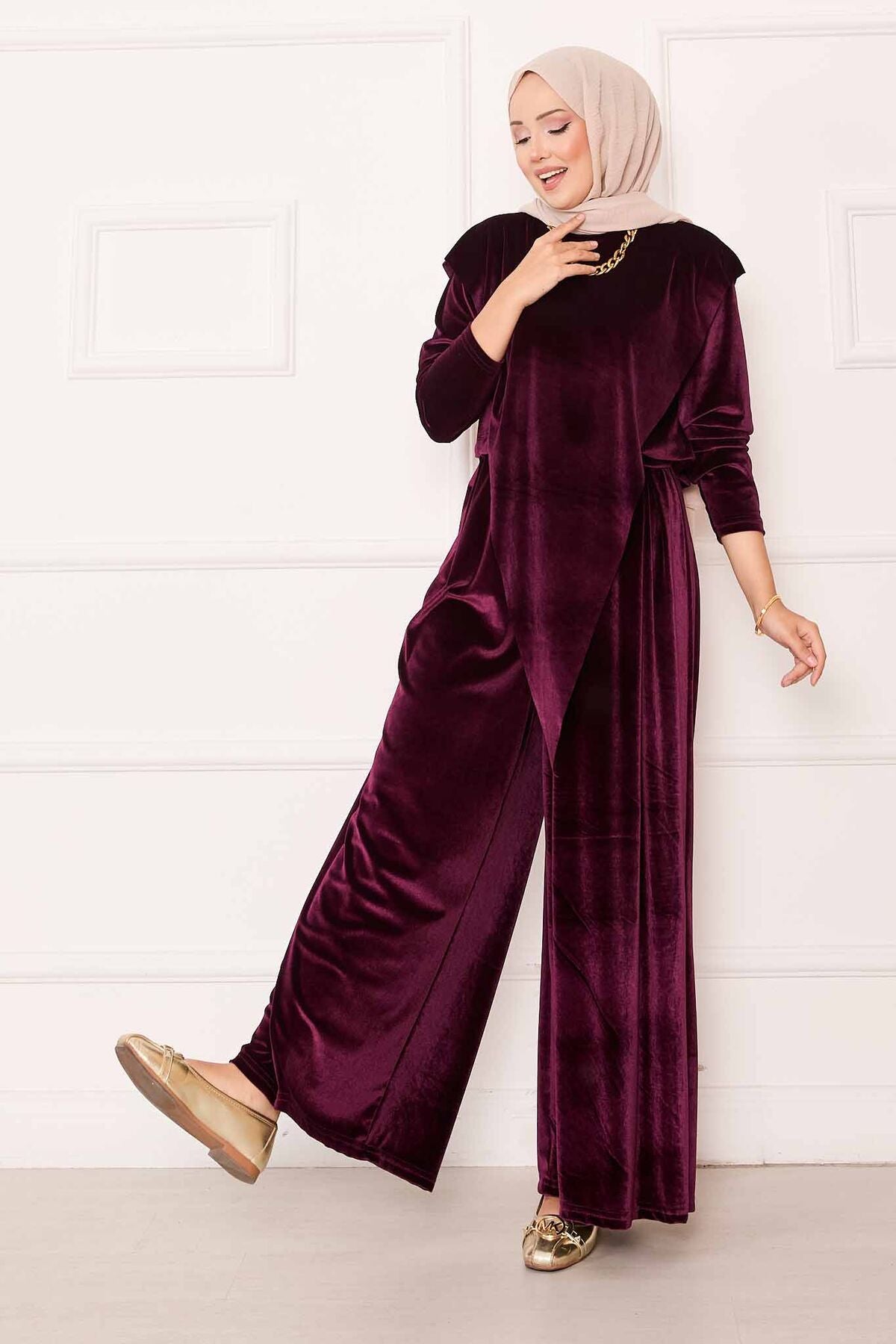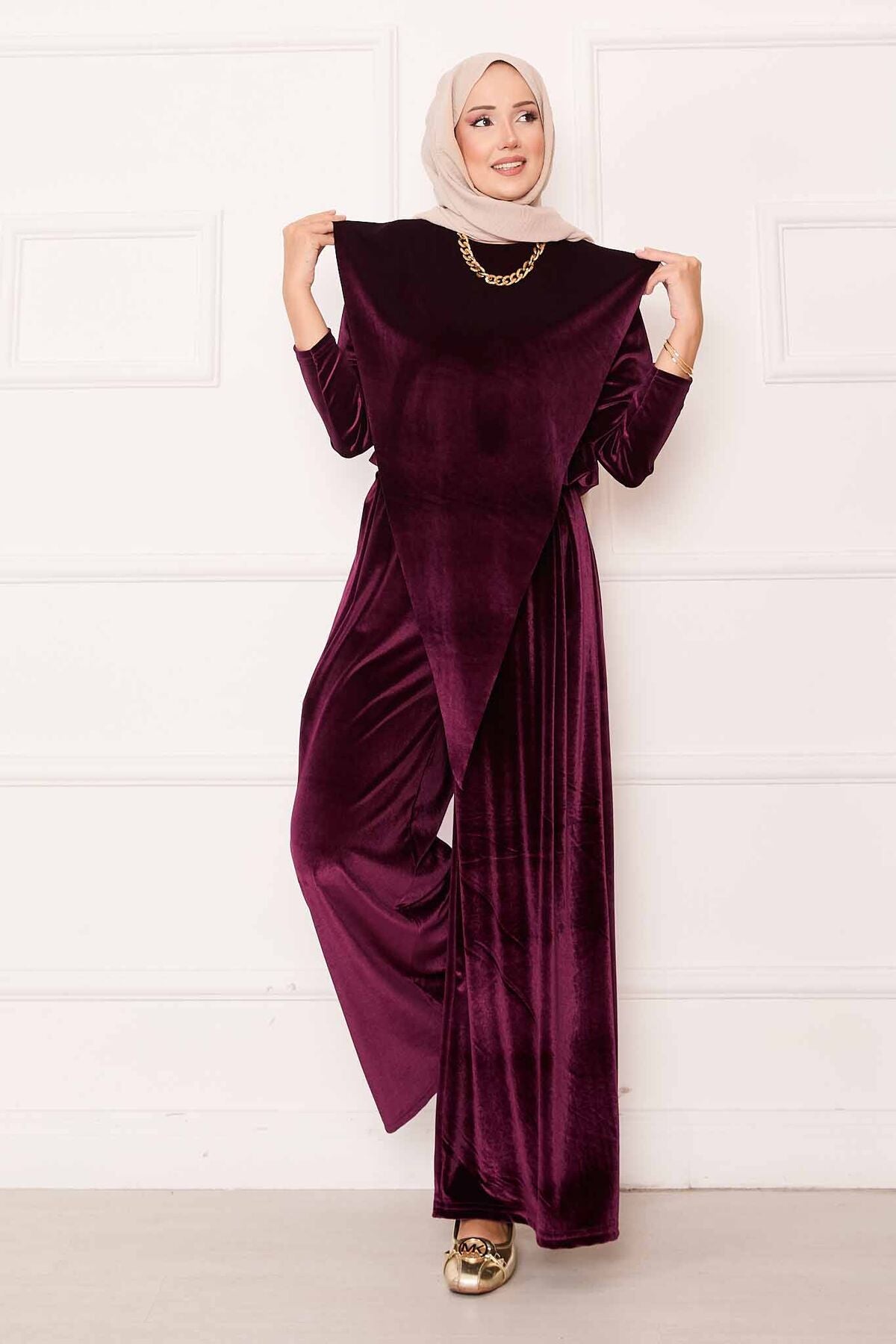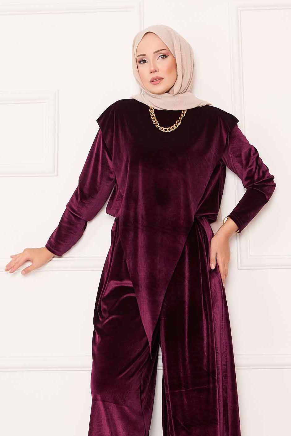 Önü Asimetrik ,Kadife Takım Mürdüm