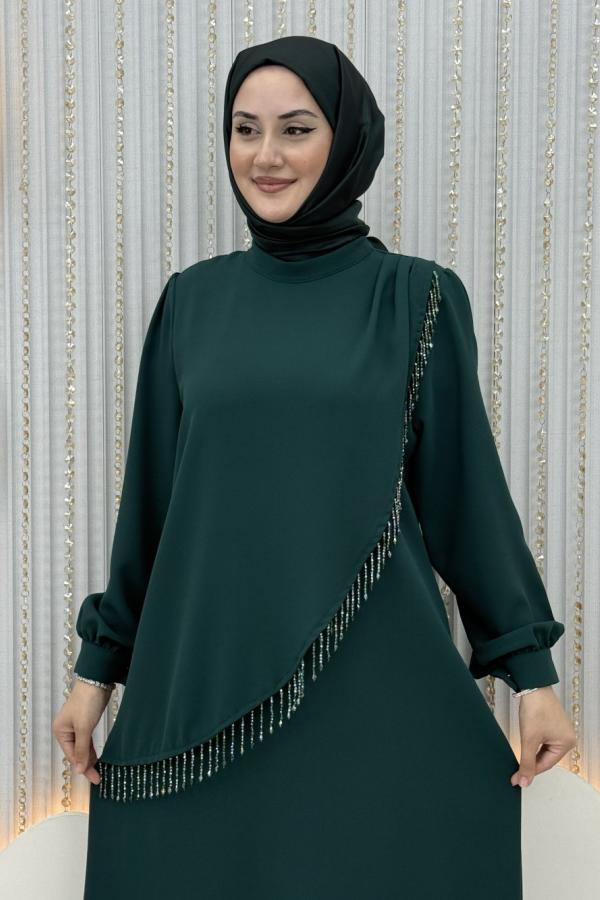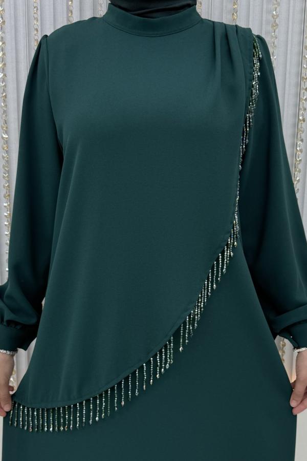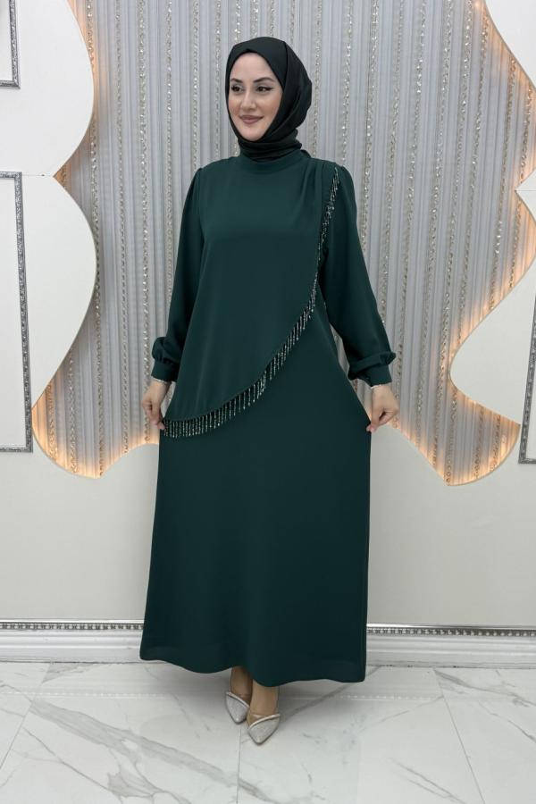 Taş işlemeli Abiye zümrüt yeşili