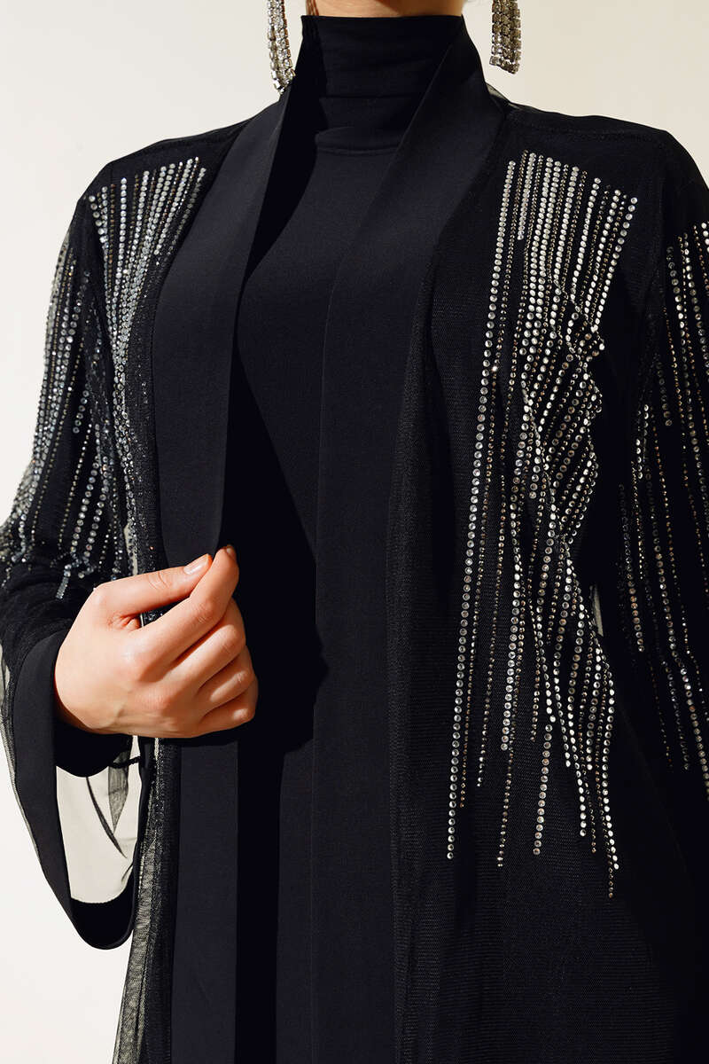 Yeni sezon abayamız şık tarzıyla sizlerle beraber. Abayamız iki parçadan oluşmaktadır. Abayamız sade olup, uzun tül hırkası taşlarla süslüdür. Kol bilekleri ribanalıdır. Kendi kumaşından kuşağı vardır. Abayamız şık ve zarif görüntüsüyle özel günlerinizin favorisi olacak.