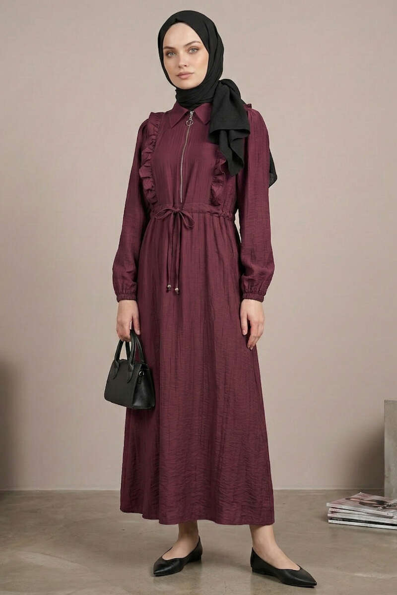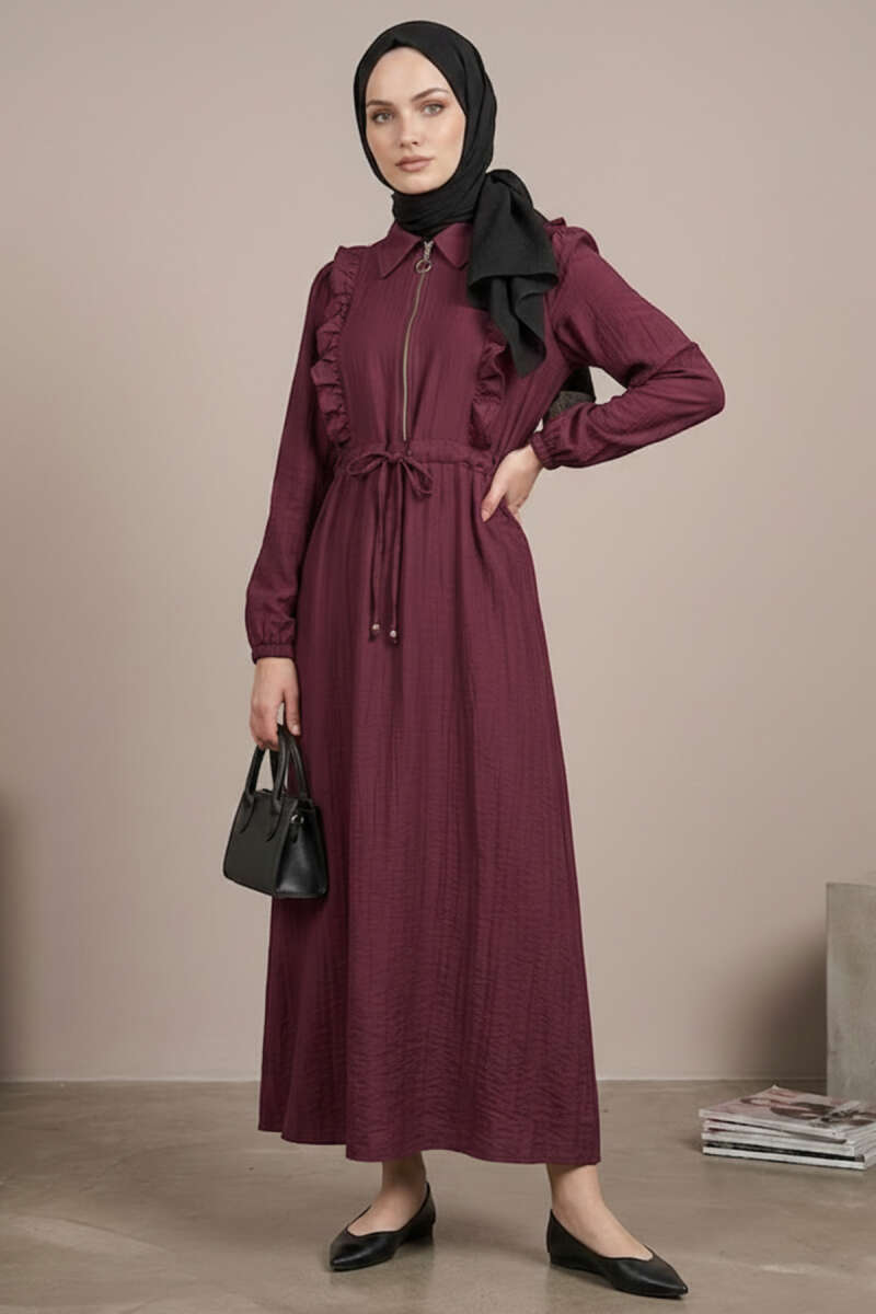 Yaka Fırfırlı Bel Tünelli Elbise bordo