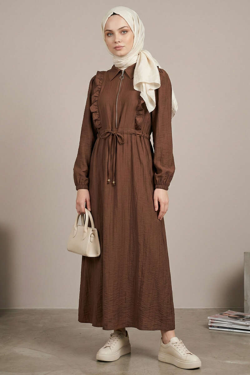 Yaka Fırfırlı Bel Tünelli Elbise kahve