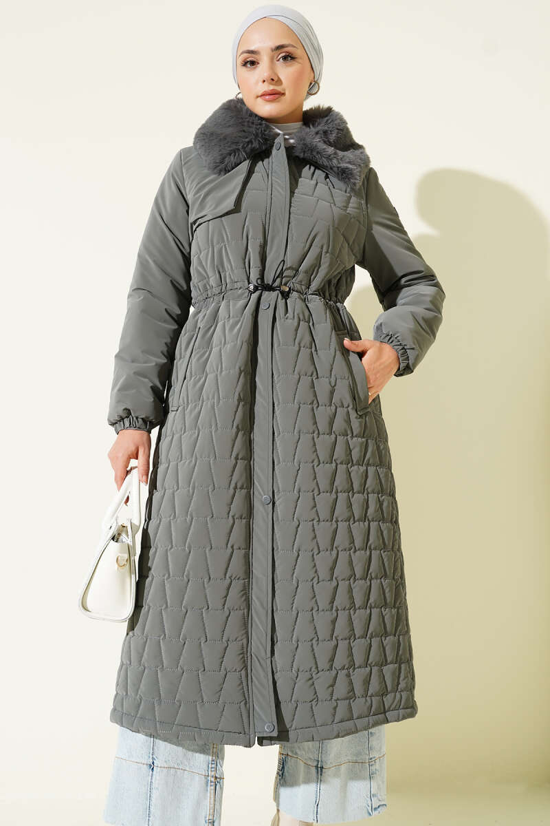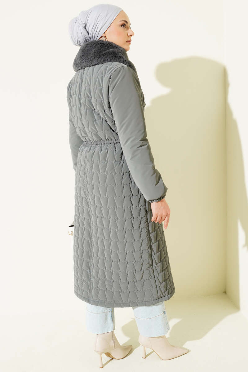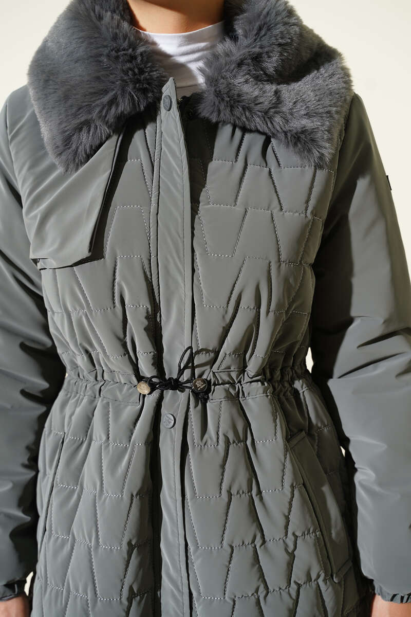 Yaka Kürklü Kapitone Uzun Mont gri