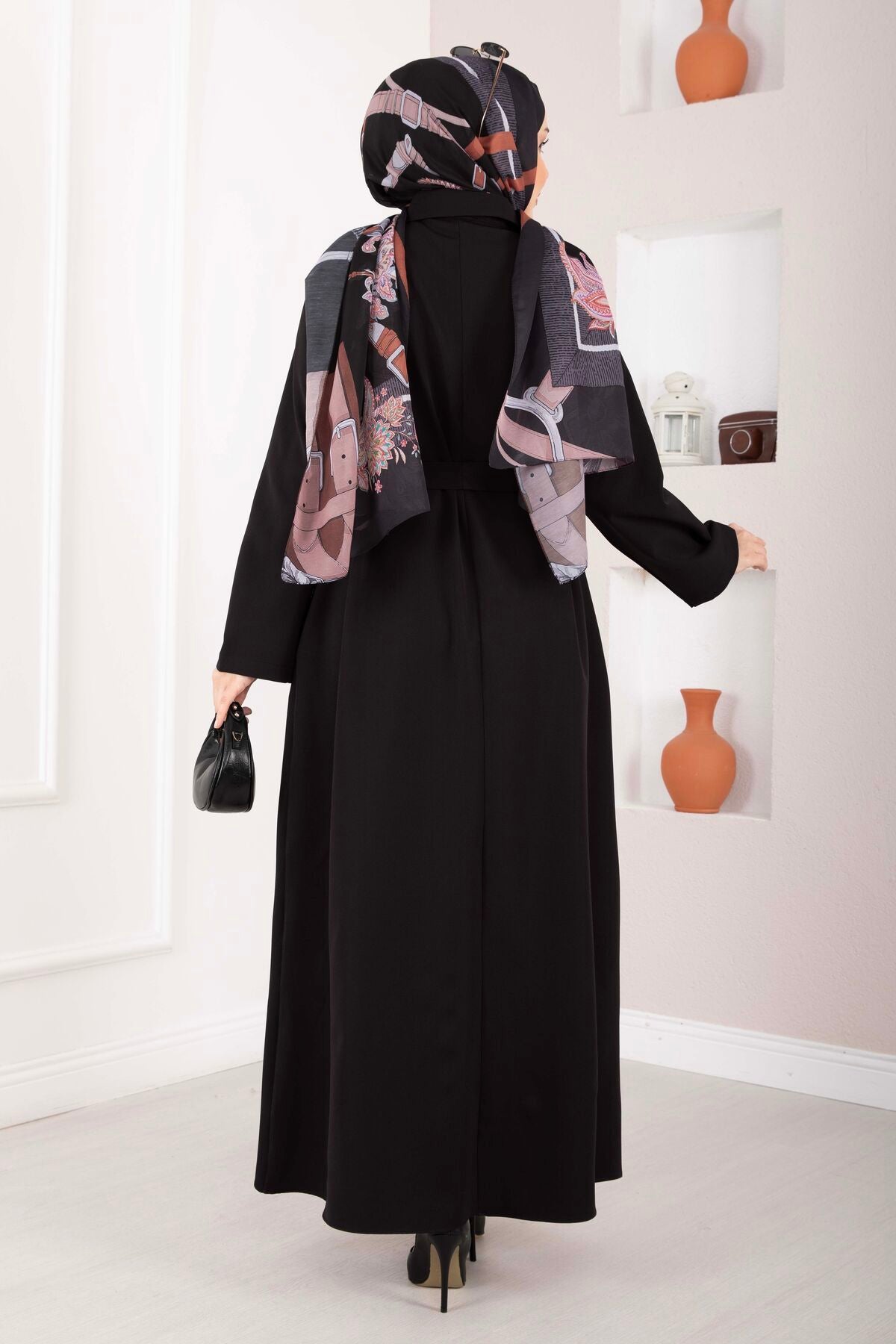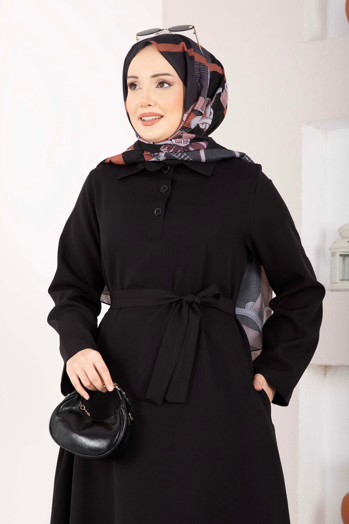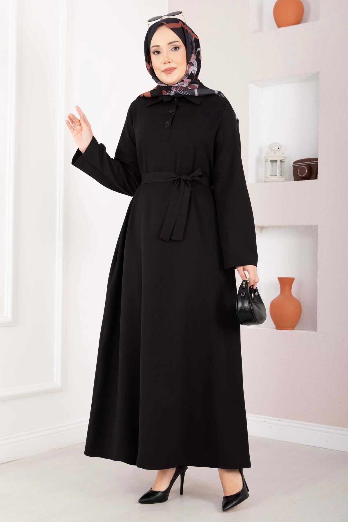 Yarım Düğmeli Kuşaklı Tesettür Elbise siyah